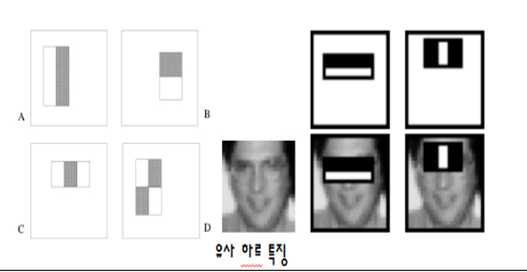 유사하르 특징은 사람의 얼굴에 특별한 패턴이 있다고 얼굴위에 흑백의 사각형을 겹쳐 밝은 영역에 속한 픽셀 값들의 평균에서 어두운 영역에 속한 픽셀값들의 평균차를 구한 후 그 차이가 일정값 이상으로 커지면 유사 하르 특징이 있다고 판단한다.